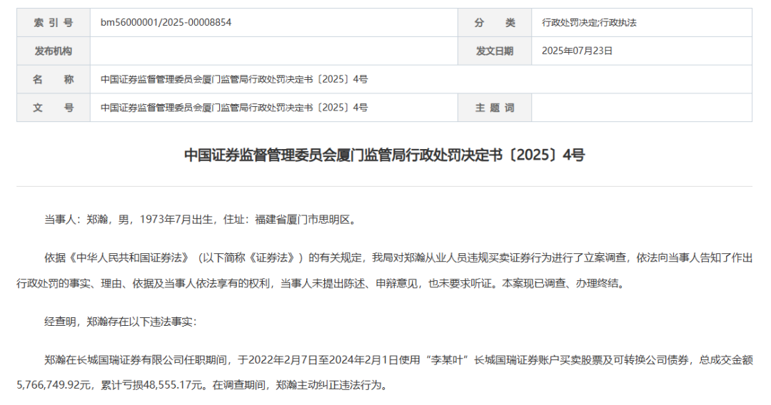 郑瀚在长城国瑞证券有限公司任职期间,于2022年2月7日至2024年2月1日使用“李某叶”长城国瑞证券账户买卖股票及可转换公司债券,总成交金额576.67万元,累计亏损4.86万元。