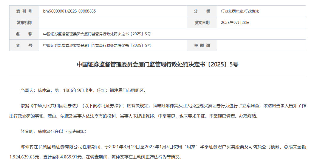 陈仲宾在长城国瑞证券有限公司任职期间,于2021年3月19日至2023年1月4日使用“周某”华泰证券账户买卖股票及可转换公司债券,总成交金额192.46万元,累计盈利4069.91元。