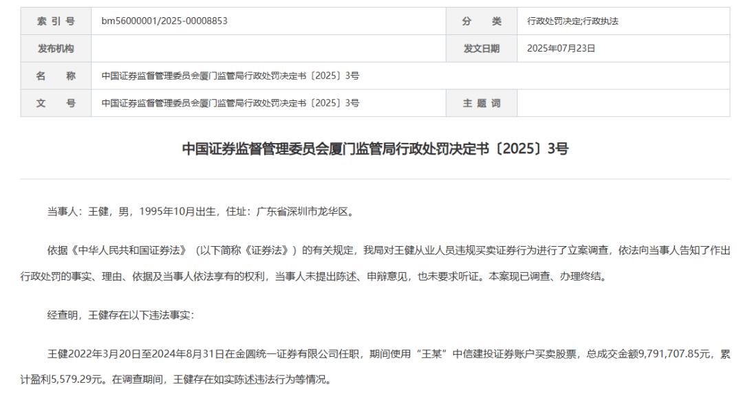 具体来看,王健2022年3月20日至2024年8月31日在金圆统一证券有限公司任职,其间使用“王某”中信建投证券账户买卖股票,总成交金额979.17万元,累计盈利5579.29元。