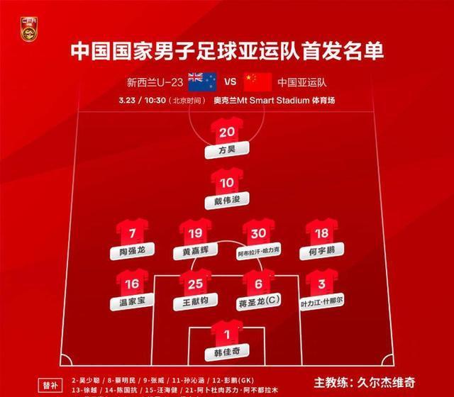 唯一稍显可惜的是,本场比赛将不会有国内的主流媒体直播,包括CCTV5也是放弃了这次转播的机会。面对新西兰亚U23,国足亚运队开局就是摆出了4-4-1-1的阵型,不出意外门将位置上依旧是上赛季在广州城发挥出色的韩佳奇,后防线上从左到右分别是温家宝、王献均、队长蒋圣龙以及叶力江,中场位置上则是陶强龙、黄嘉辉、阿布拉汗以及何宇鹏首发,定在最前面的是方昊,而埋伏在他身后的则是身穿10号球衣的戴伟浚。