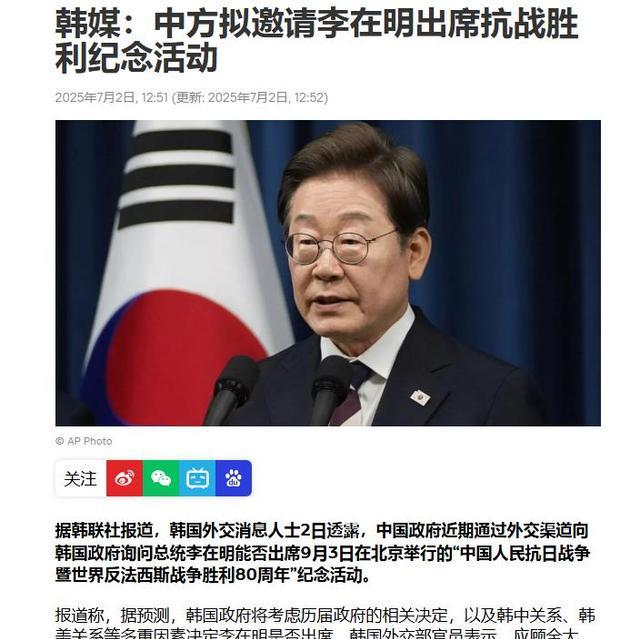 据韩联社报道,韩国外交消息人士2日透露,中国政府近期通过外交渠道向韩国政府询问总统李在明能否出席9月3日,在北京举行的“中国人民抗日战争暨世界反法西斯战争胜利80周年”纪念活动……