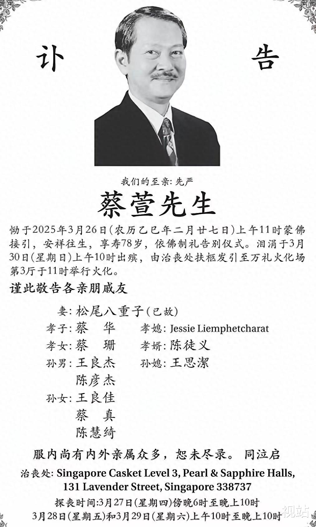 讣告中提到,蔡萱于3月26日上午11时病逝,享年78岁,其出殡仪式将于3月30日举行,随后进行火化,蔡萱的日本妻子也早已过世,葬礼由儿子蔡华负责。蔡萱的灵堂将设于新加坡殡仪馆,从27日起向亲友开放吊唁。