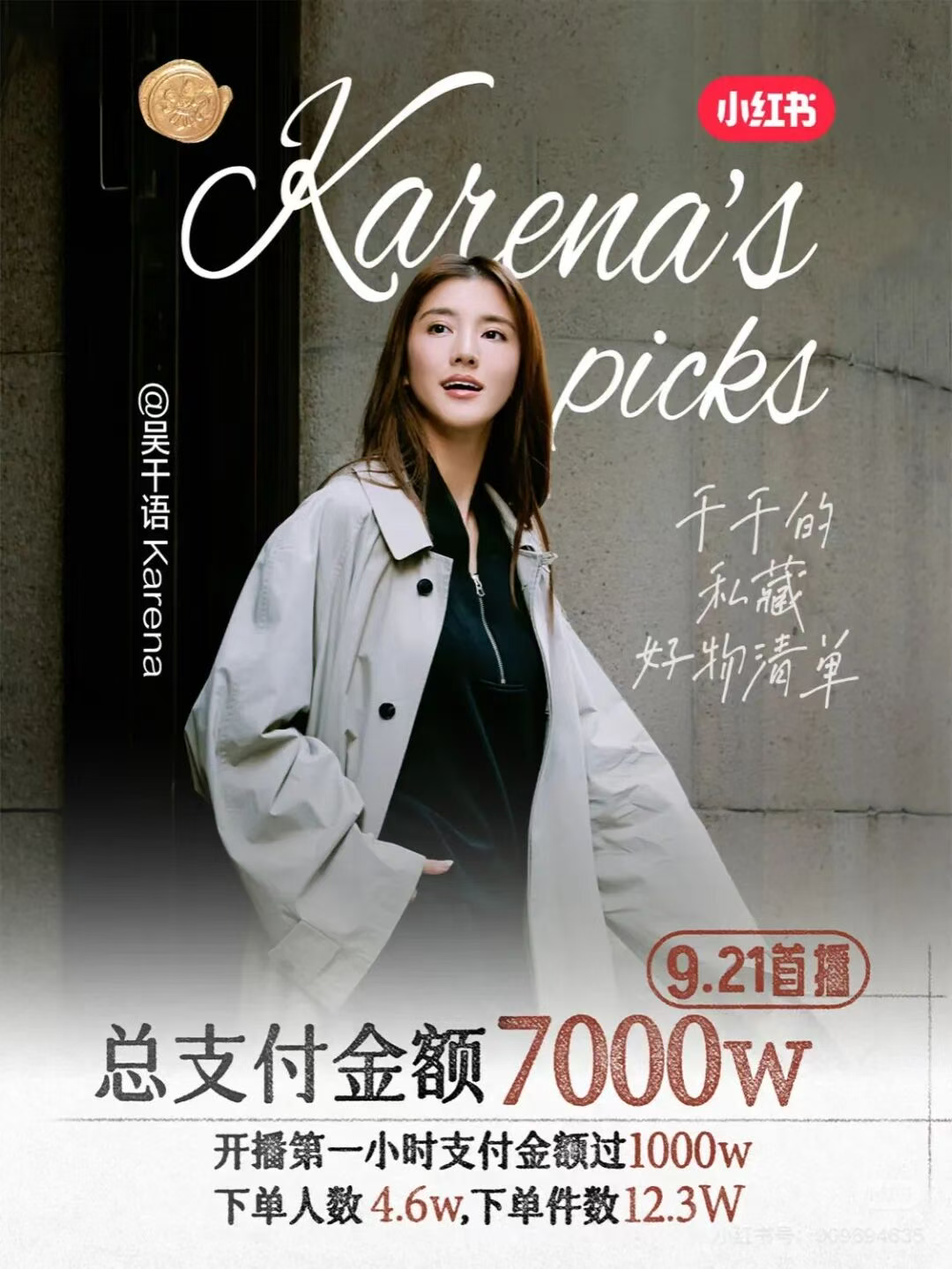 9 月 21 日,香港明星吴千语在小红书的首场直播便交出了一份亮眼成绩单:订单量达4.6万份,总GMV突破7000万元,超越了董洁与章小蕙当年的首秀表现。