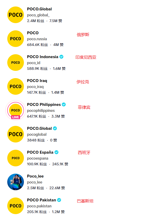 在TikTok上,POCO打造了账号矩阵。除了建立了自己的品牌主账号@poco_global_外,还在俄罗斯、印度尼西亚、伊拉克、菲律宾、西班牙、巴基斯坦等国分别建立了对应账号。