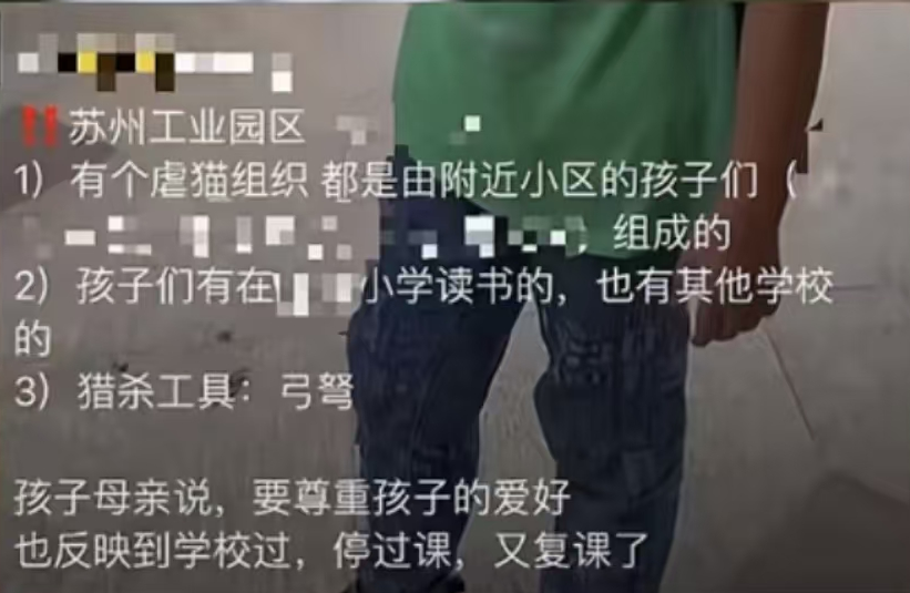 男孩还表示,他们一起杀猫的是有一个“组织”的,上至初中生,下至4年级的小学生都有参加,但最低是4年级,他们并非是一个学校和小区的!