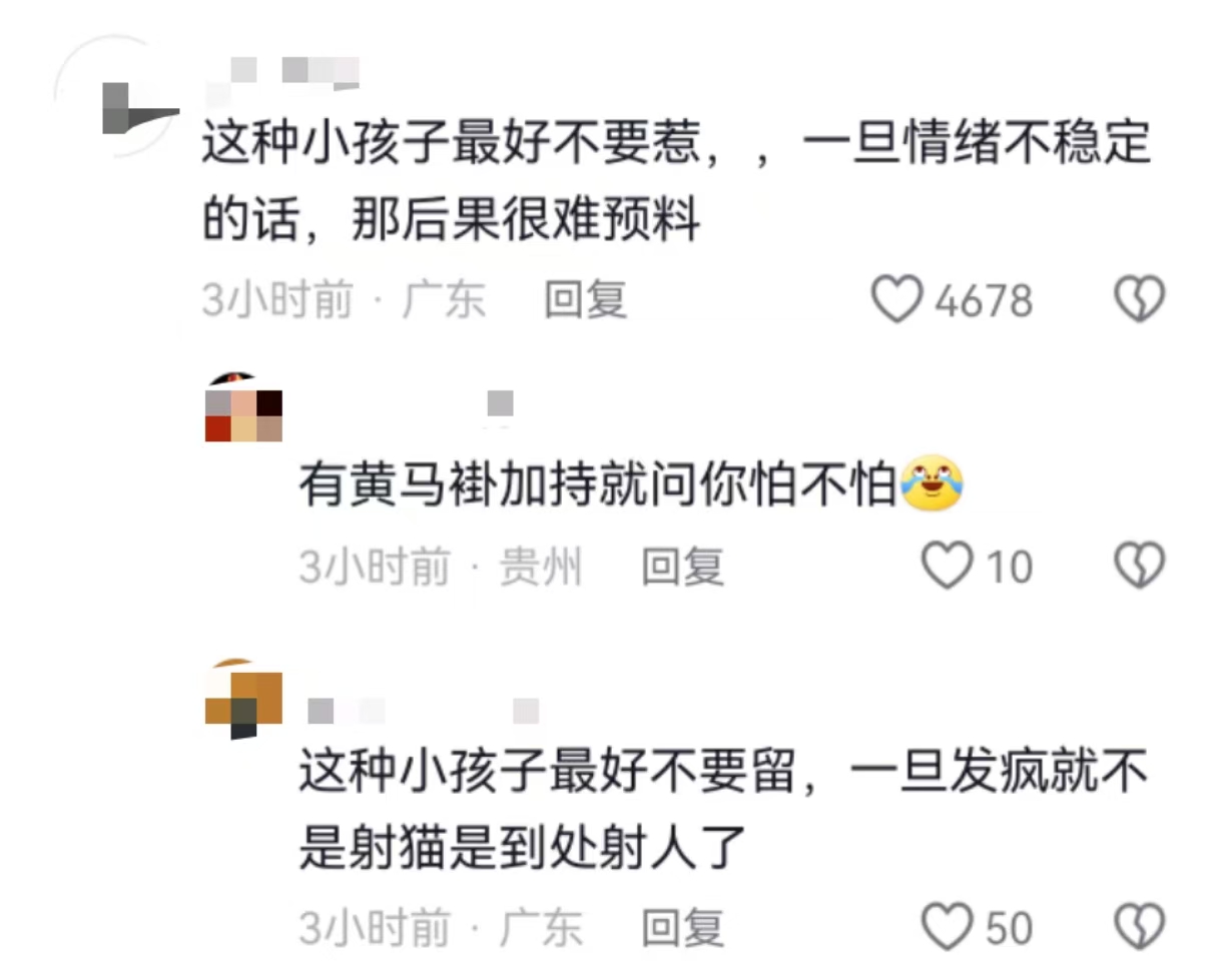 还有网友则对孩子的成长表示担忧,称这种孩子最好不要惹,的确,在一个将“杀戮”视作骄傲,视作爱好的人眼里,或许我们每一个人,都像是他手上猎杀过的一只猫一样...