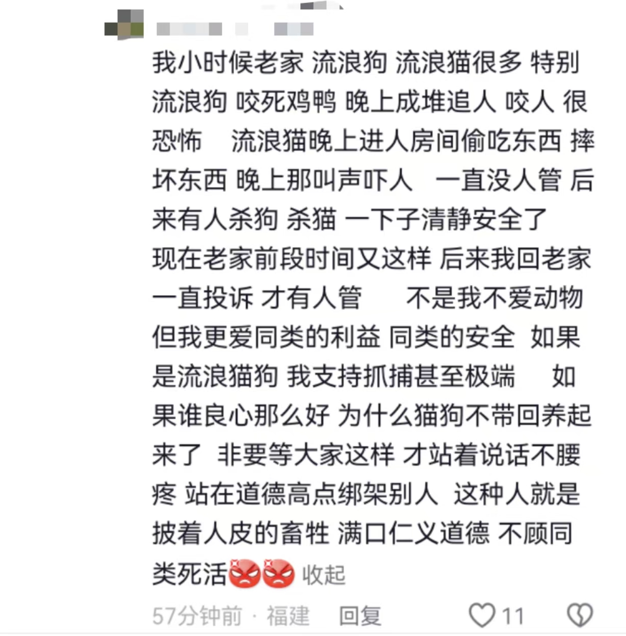 但还有网友却提出了不同的看法,这位网友声称,自己小时候在老家,流浪猫成群结队,也没人管,时常会攻击人们,因此对于孩子杀猫这件事儿,这位网友持赞成态度!