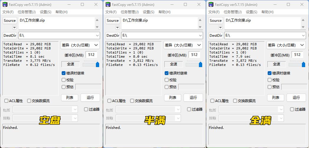 使用Fastcopy在硬盘空盘、半满、全满状态下分别测试,将一个30GB大小的压缩文件,拷入到奥睿科IG740固态硬盘里,三种状态下,平均写入速度均达到了3800MB/s,用时基本都是8秒。