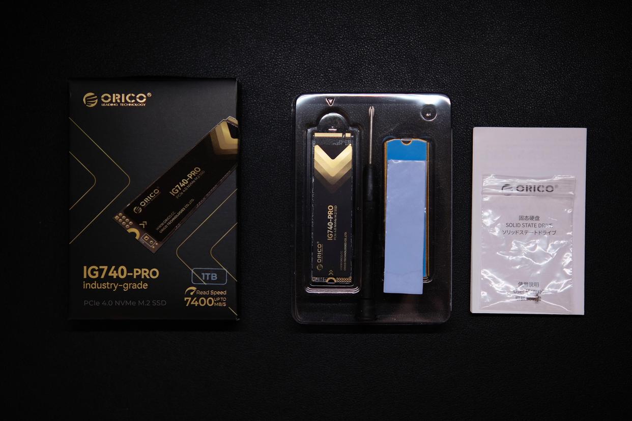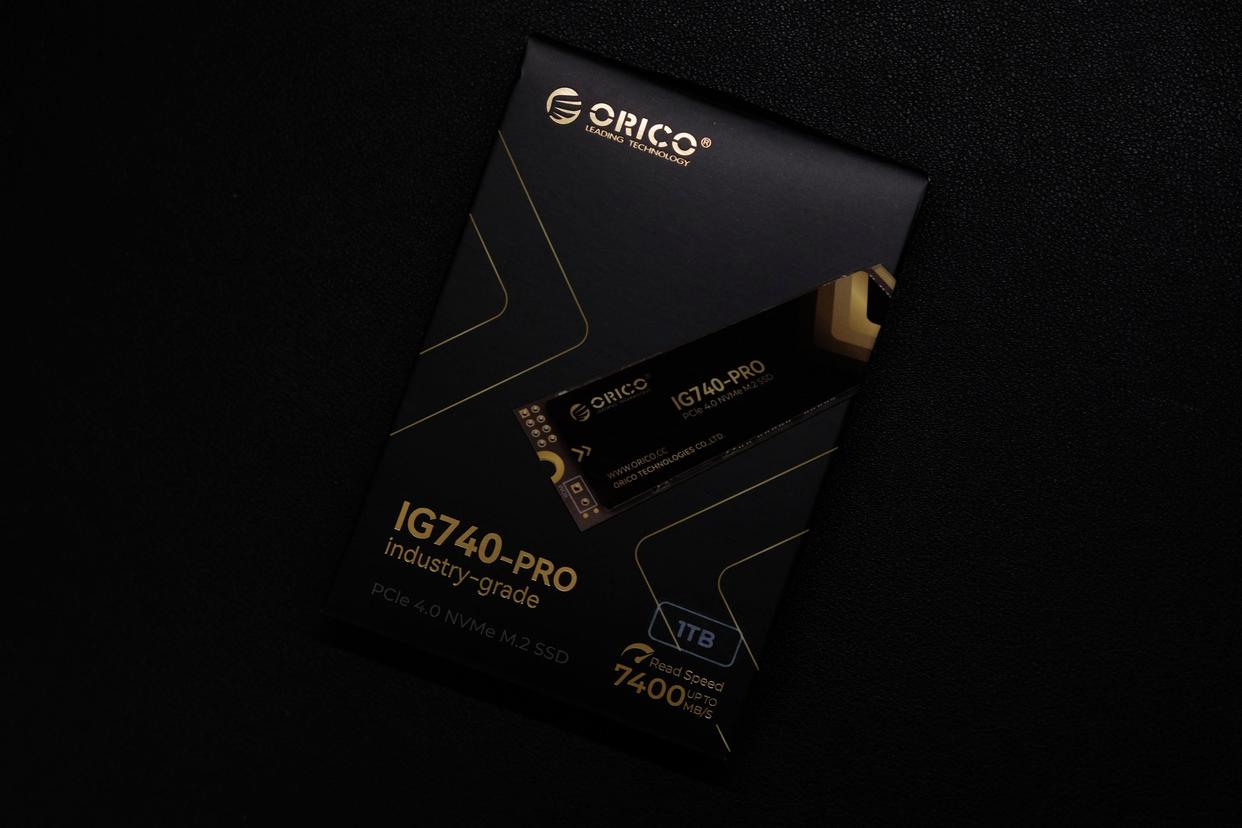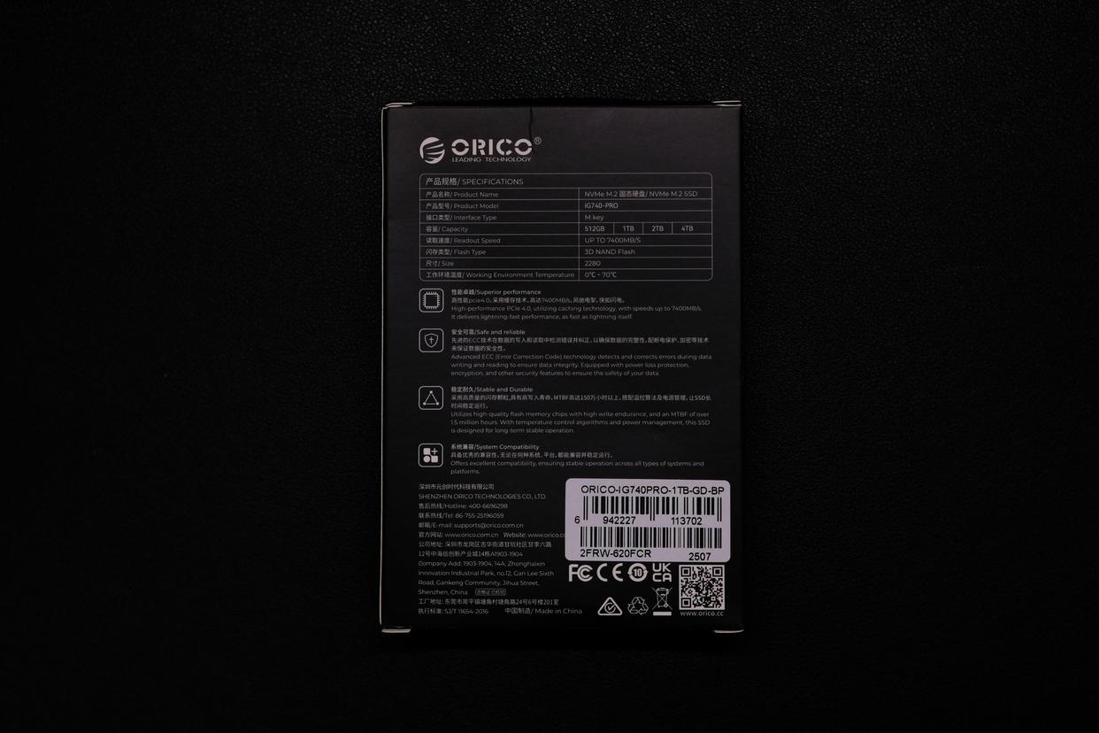 奥睿科IG740固态硬盘采用纯黑色包装,正面印有硬盘的实物渲染图,ORICO品牌LOGO、产品型号以及最大7400MB/s读写速度都采用金色印刷,整体黑金色风格,质感满满,十分有高级感。