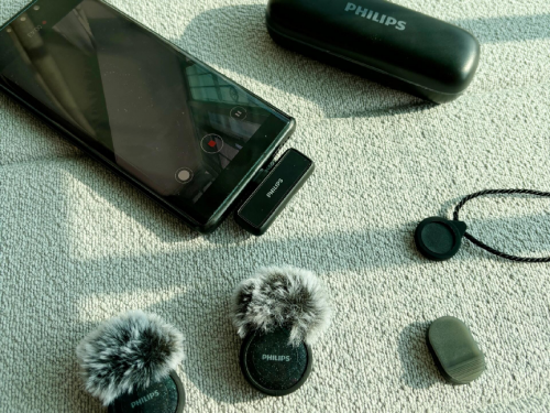 飞利浦DLM3545C主打小巧轻便,单麦重量仅12克,夹在衣领上几乎无感。内置360°全向电容麦头,能够稳定捕捉人声,配合DSP智能降噪,在安静环境下表现干净。采样率48kHz/16bit,声音还原较自然。续航方面,单麦可用9小时,配合充电仓可延长至25小时,满足中等强度使用。传输距离标称50米,常规拍摄完全足够,但在复杂环境中可能偶有断连。整体定位偏轻便实用,尤其适合需要经常随身携带、又希望兼顾兼容性的用户。