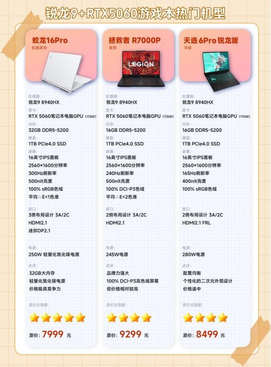 年终购物季,正是为你的游戏阵容挑选一位得力“拍档”的好时机。如果你已将目标锁定在 锐龙9 8940HX + RTX 5060这一性能与价格平衡的黄金组合上,那么机械革命蛟龙16 Pro、联想拯救者R7000P和华硕天选6 Pro 锐龙版这三款热门机型,很可能就是你正在斟酌的选项。它们核心性能相当,却各有鲜明的个性取向。下面,我们将通过清晰的对比与场景化分析,帮你做出最明智的选择。