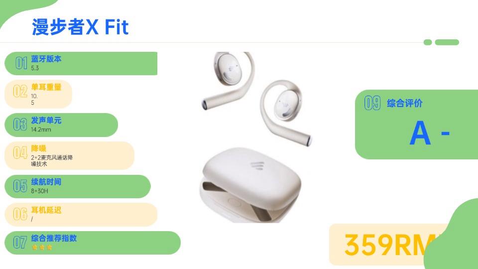 作为音频领域的老牌品牌,漫步者在运动音频领域深耕多年,旗下漫步者X Fit开放式耳机凭借创新设计与实用配置,具备较强的市场竞争力。这款耳机采用高密闭性气导声腔,结合空气传导防漏音设计,既能保障声音的私密性,又搭配14.2mm PU+羊毛纸动圈单元与动态低频增强技术,让音质呈现出饱满厚实的特点,为用户带来优质听觉体验。