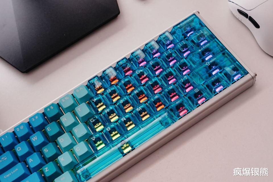 ALUX60这款键盘还内置了靓丽的RGB灯效,RGB除了支持快捷切换外,也可以通过驱动调节动态效果,透明键帽加持下,RGB效果非常带感,在提升桌面氛围上有着不错的表现。