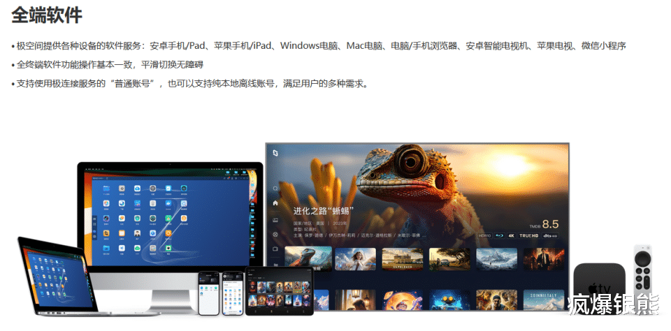 生态适配性上,极空间提供了几乎覆盖所有终端的应用程序,包括安卓/iOS手机平板、Windows/macOS电脑、智能电视等,甚至支持微信小程序和网页端访问。更难得的是,各端功能保持一致,且登录体验极佳(尤其是手机端自动登录、TV端扫码登录),实现了真正的跨平台无缝切换。