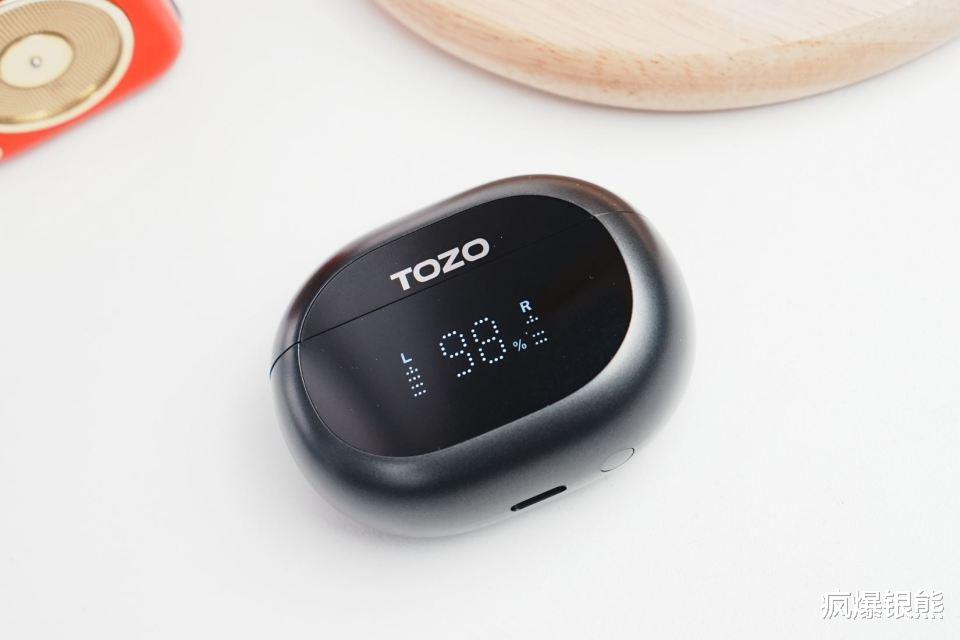 TOZO NC20的充电仓采用鹅卵石造型设计,表面经过细腻的磨砂处理,不仅手感舒适且防滑防指纹,整体小巧便携。电池仓正面设计有一个显示屏,可清晰显示耳机和电池仓剩余电量。