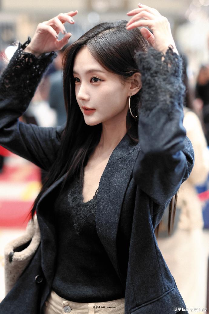 李一桐上身选择的灰色蕾丝袖边装饰西装外套,是整套造型 “韩系感” 的核心。灰色作为中性色,自带低调高级的质感,没有黑色西装的沉闷,也没有亮色西装的张扬,完美契合韩系时尚的柔和调性。而袖边的蕾丝装饰则是 “点睛之笔”,细腻的蕾丝打破了西装的硬朗感,为整体造型注入了柔美与精致,让基础款西装瞬间摆脱 “职场工装” 的刻板印象,多了几分女性特有的优雅与浪漫。落气质。