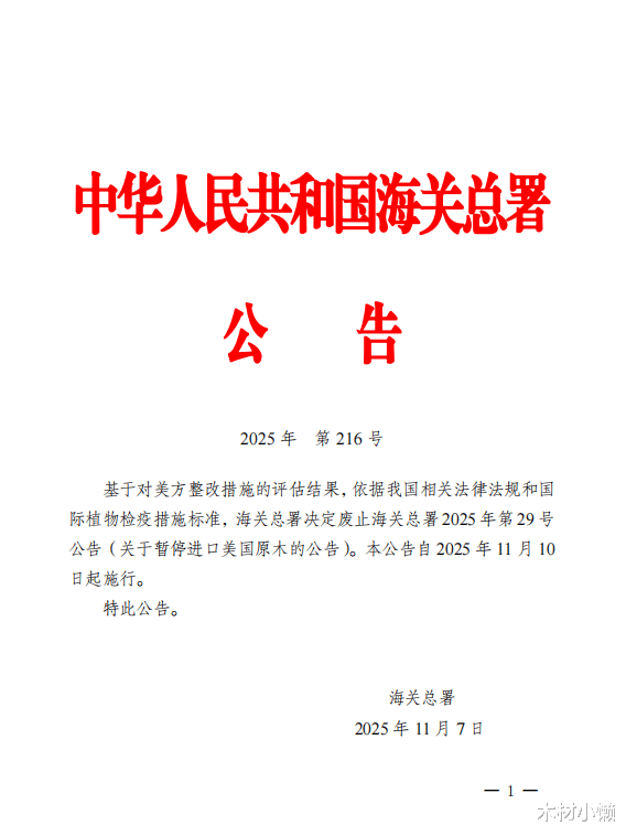 根据海关总署发布的第216号公告,基于对美方整改措施的综合评估,并依照我国相关法律法规及国际植物检疫措施标准,海关总署决定废止此前发布的《关于暂停进口美国原木的公告》(海关总署2025年第29号)。该决定自2025年11月10日起生效。
