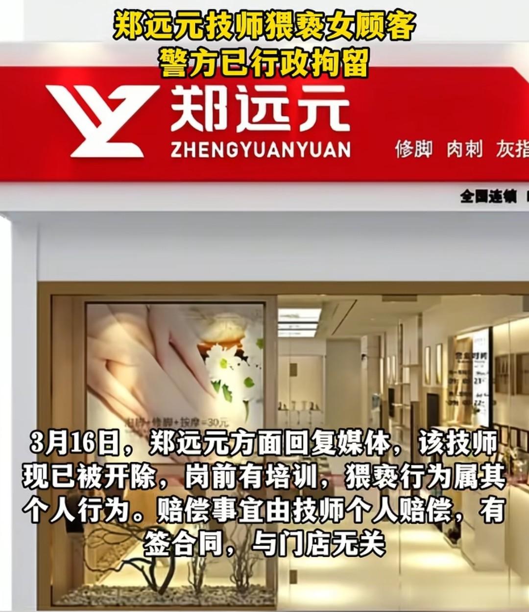 3月16日,律师陈先生称:“门店推卸不了责任,赔礼道歉、精神损害赔偿,一样都跑不了。”当记者联系上郑远元总部,总部的回应跟门店如出一辙:“岗前有培训,猥亵行为属其个人行为,赔偿由技师个人承担,有签合同,与门店无关!”