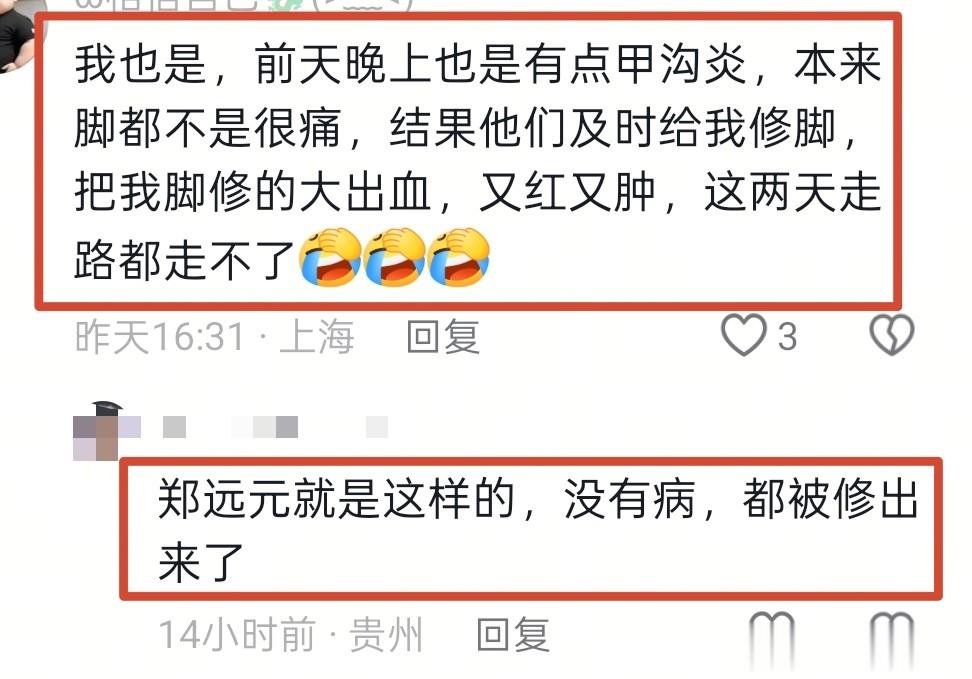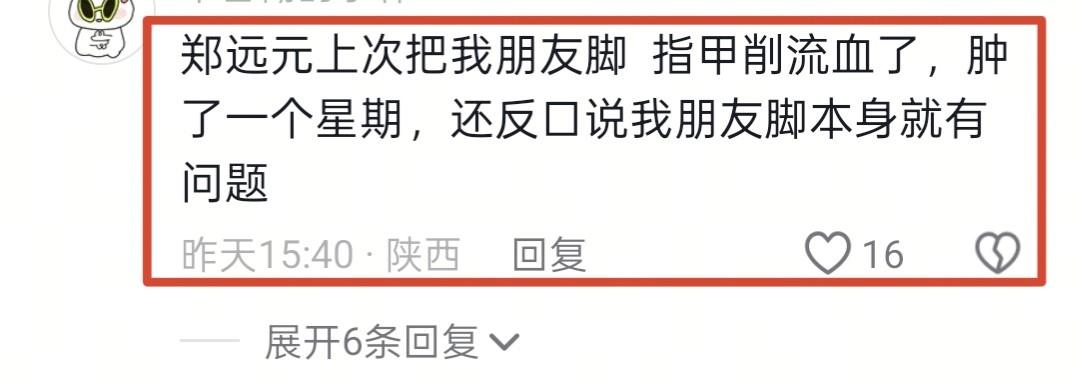 也有网友说: “郑远元上次把我朋友脚指甲削流血了,肿了一个星期,还反口说我朋友脚本身就有问题!”