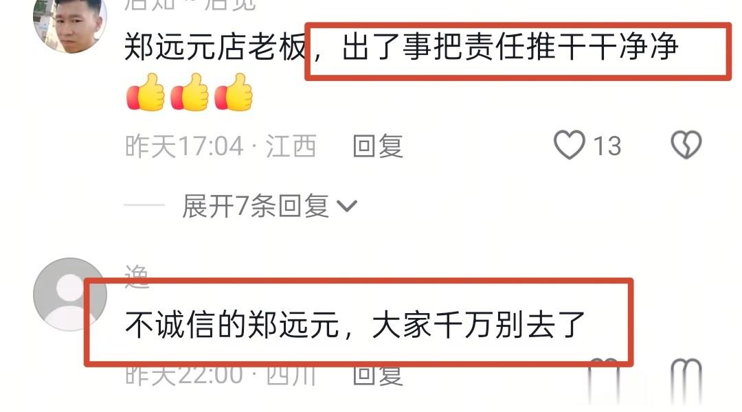 还有网友说:“郑远元店老板不诚信,出了事把责任推干干净净!”