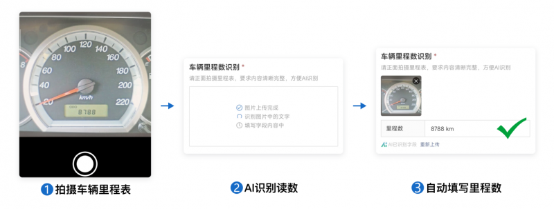 人工填写慢、易出错,可利用AI功能自动识别照片填写数据,既保证了数据的准确性,又保障了记录的真实性。比如用AI识别里程表,自动填写里程数。