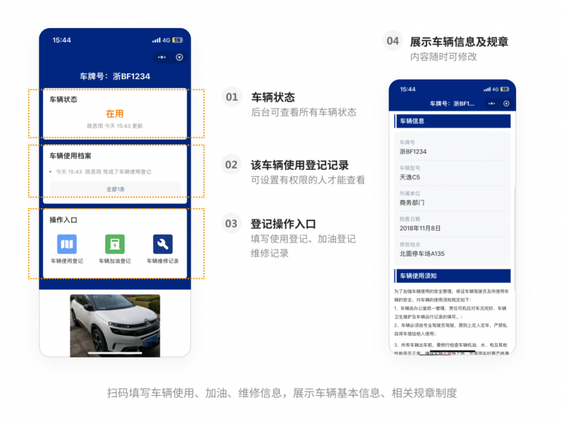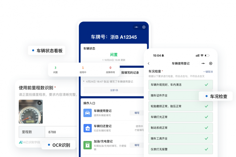 机关或中小企业通常只有几辆公用车,用二维码取代纸质登记本。员工扫码就能申请用车、填写还车记录。每次用车和还车时,扫码拍照记录油耗、里程和车况。让用车流程透明、责任容易追溯。免费版就能满足需求,几乎没有使用成本。