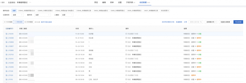 还可以添加车辆状态,与表单联动,例如登记用车记录后,系统自动将车辆状态标记为“使用中”;归还后自动恢复“空闲”。