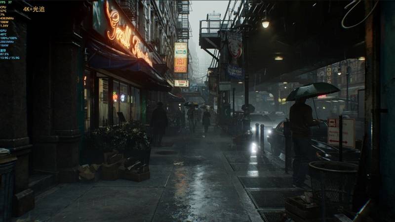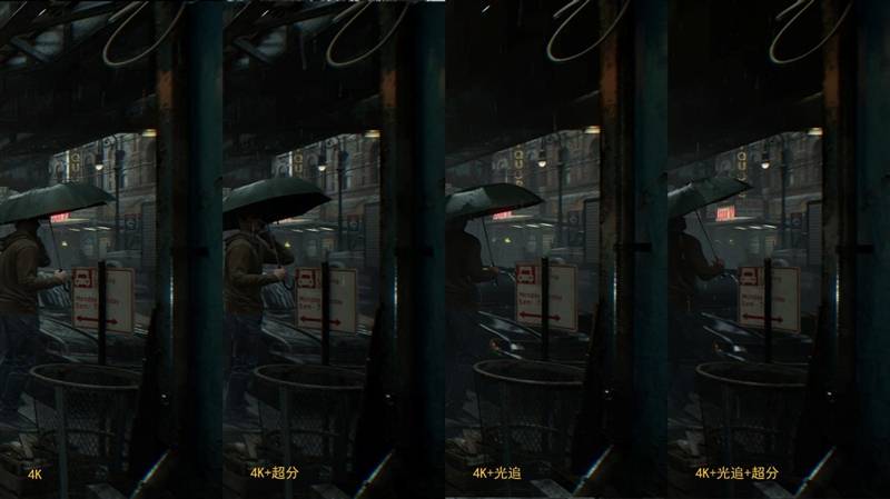 从细节对比中,可以很明显地看到,开启光追之后,画面中明暗对比更加真实自然,暗部更暗,对比更加强烈,特别是画面右侧车身上的反光,开启光追之后才能看出被雨水淋湿后的光泽,伞下人物身上的光线也更加微弱,更真实还原了实际光照的效果。