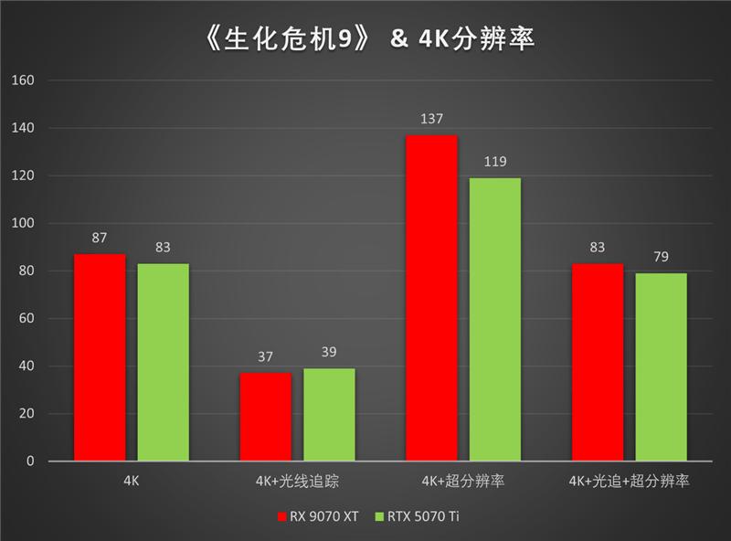 在4K分辨率下,AMD Radeon RX 9070 XT不开启光追也不使用超分辨率时,《生化危机9》可达到87帧,略领先RTX 5070 Ti,但启用光追后,两张显卡的帧率都会降低50%以上,光追对性能的需求还是十分高。