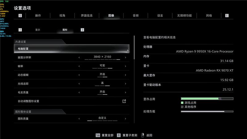 所以这次测试中,我们就没有选择和AMD Radeon RX 9070 XT同级别的RTX 5070显卡进行对比,就是考虑到RTX 5070的12GB显卡,在现在游戏以4K分辨率特效全开运行时,再启用光线追踪和超分辨率,可能已经不太够用了。