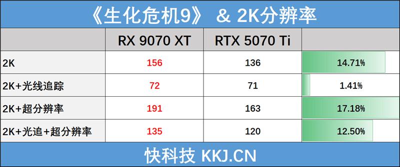 在2K分辨率下,AMD Radeon RX 9070 XT相比NVIDIA GeForce RTX 5070 Ti的优势更大了,能超过10%,而且无论是纯光栅性能,还是使用超分辨率配合光线追踪,都基本可以满足2K144Hz电竞显示器的需求,对游戏玩家来说性能刚刚好。