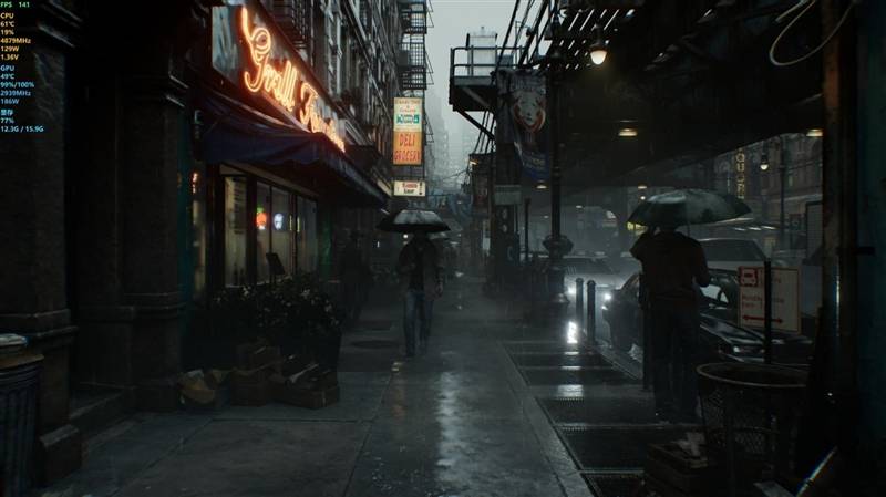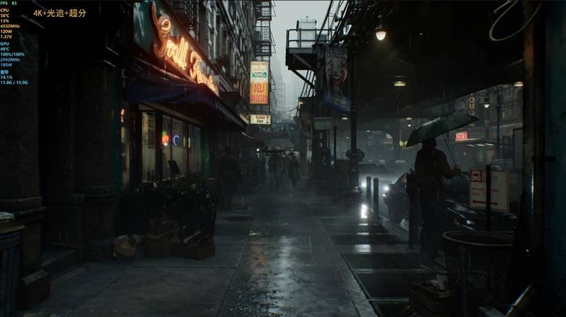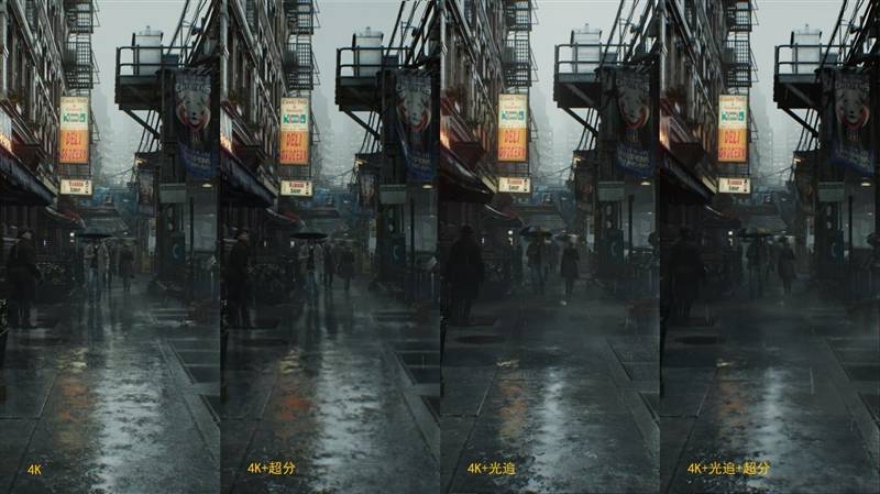 当光线追踪关闭时,画面仿佛是上个时代的游戏,灰扑扑没有层次感,几乎看不出场景正在下雨,但开启光线追踪后,画面的质感和层次立刻得到巨大提升,下雨的潮湿感和湿漉漉的车身反光,让画面更加真实。