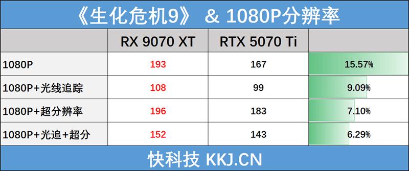 1080P分辨率对于AMD Radeon RX 9070 XT来说就非常轻松了,纯光栅性能就能跑到接近200帧,即使不使用超分辨率技术,直接启用光线追踪,也能跑到100帧以上,对比NVIDIA GeForce RTX 5070 Ti的优势超过10%。