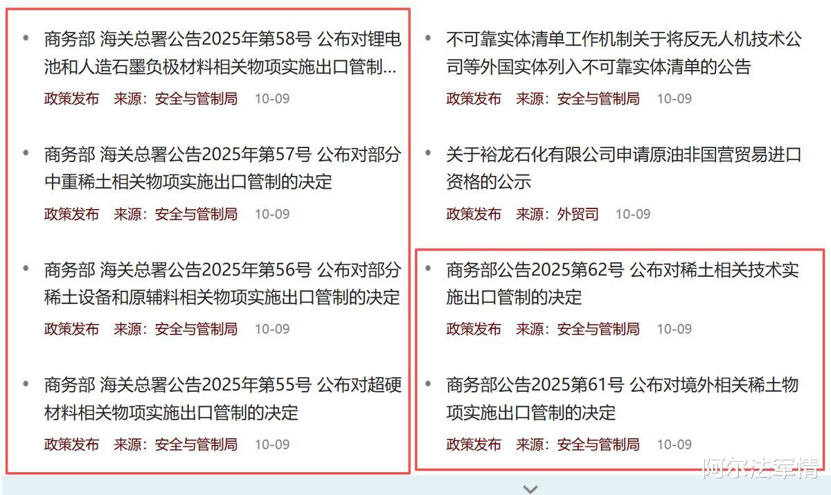 除了两条关于稀土的——限制稀土相关技术出口、对境外相关稀土物项实施出口管制以外,还有四则公告,分别为——对超硬材料相关物项、部分中重稀土相关物项、部分稀土设备和原辅料相关物项、锂电池和人造石墨负极材料相关物项实施出口管制。