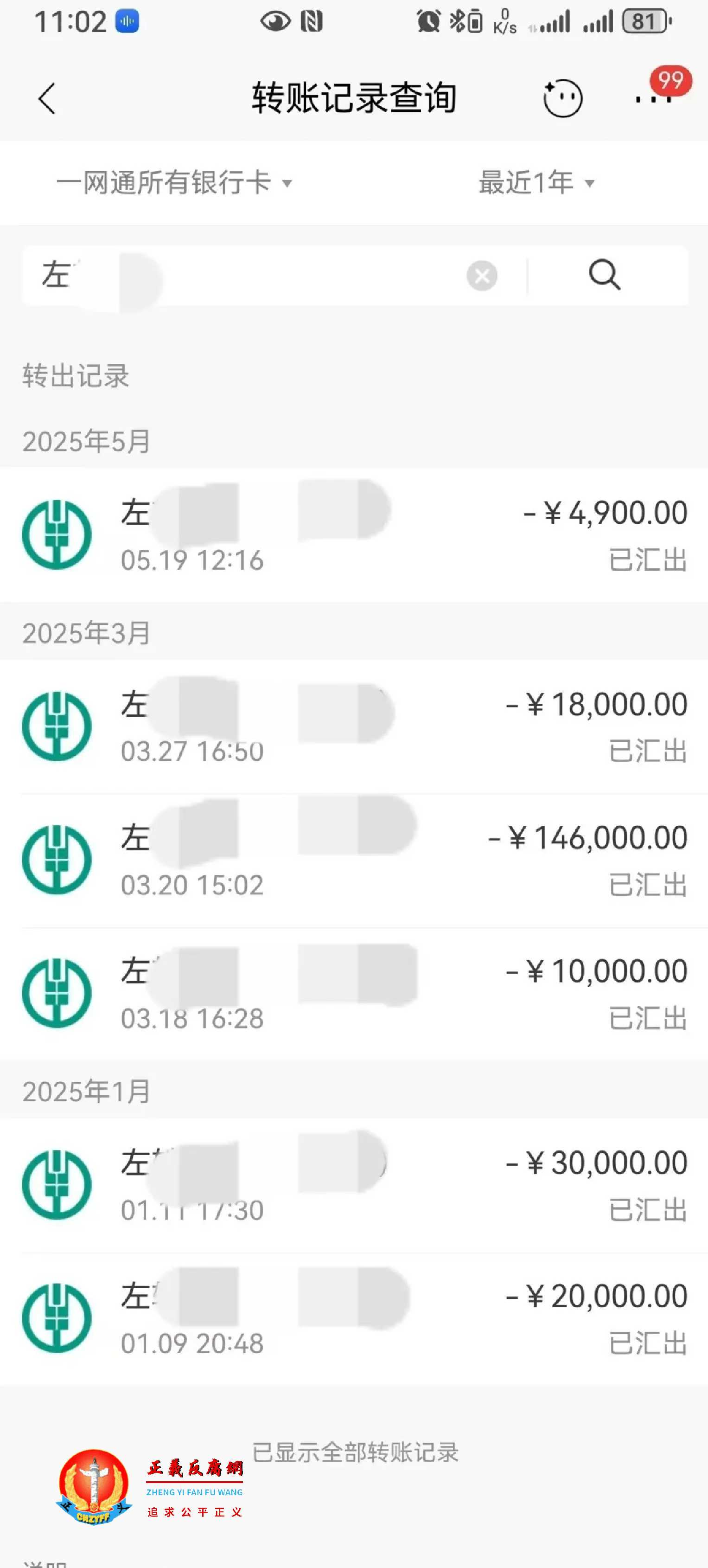▲李明给左某某的部分转账记录截图。(图片来源:受访者供图)