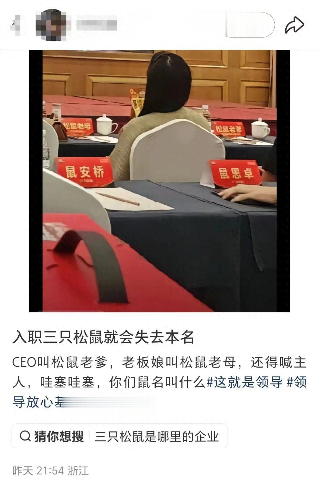 日前,有网友在社交平台发帖称,在入职三只松鼠后会失去本名,因为员工会将自己的名字改为“鼠某某”。据该网友发布的照片显示,在一会议现场上,每个座位都摆放着以“鼠”字开头的名牌,如“松鼠老爹”“松鼠老母”等。据介绍,“松鼠老爹”即公司创始人章燎原。