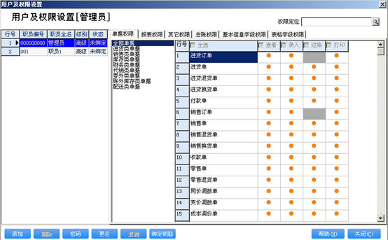 操作员权限设置只能由管理员来完成,鼠标点蓝要设置权限的操作员,然后选择要设置的权限,在相应的单元格打点,表示拥有该权限。