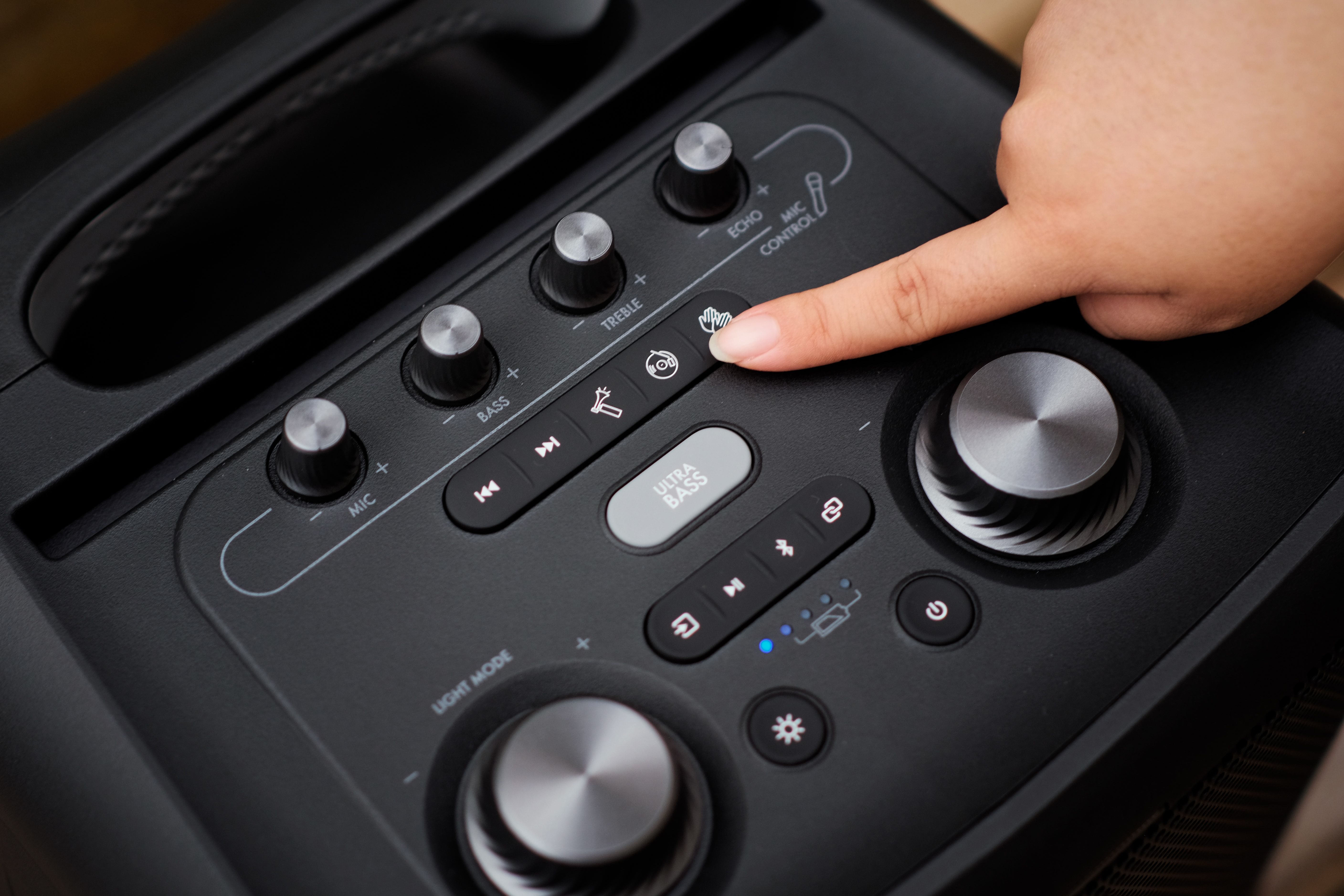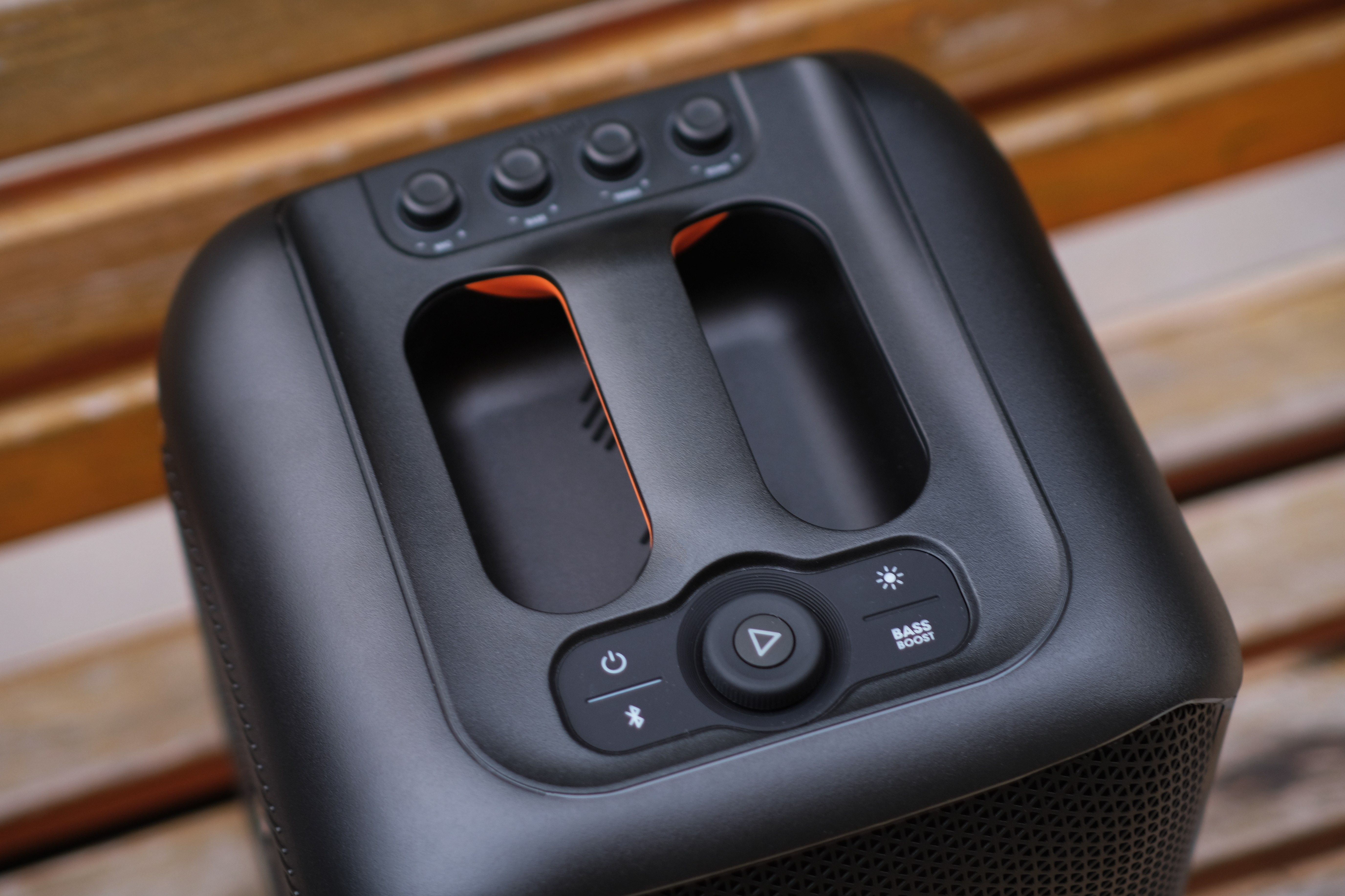 接下来聊聊操作面板,毕竟这玩意儿是要天天用的,顺手不顺手太重要了。两款的按键都在顶部,低头就能看到,这点挺方便。JBL PartyBox Encore 的按键布局比较紧凑,音量旋钮和播放暂停键是集成在一起的,第一次用的时候差点拧错,习惯了才发现其实也挺省空间的。它的按键反馈比较轻柔,也没有什么反馈。