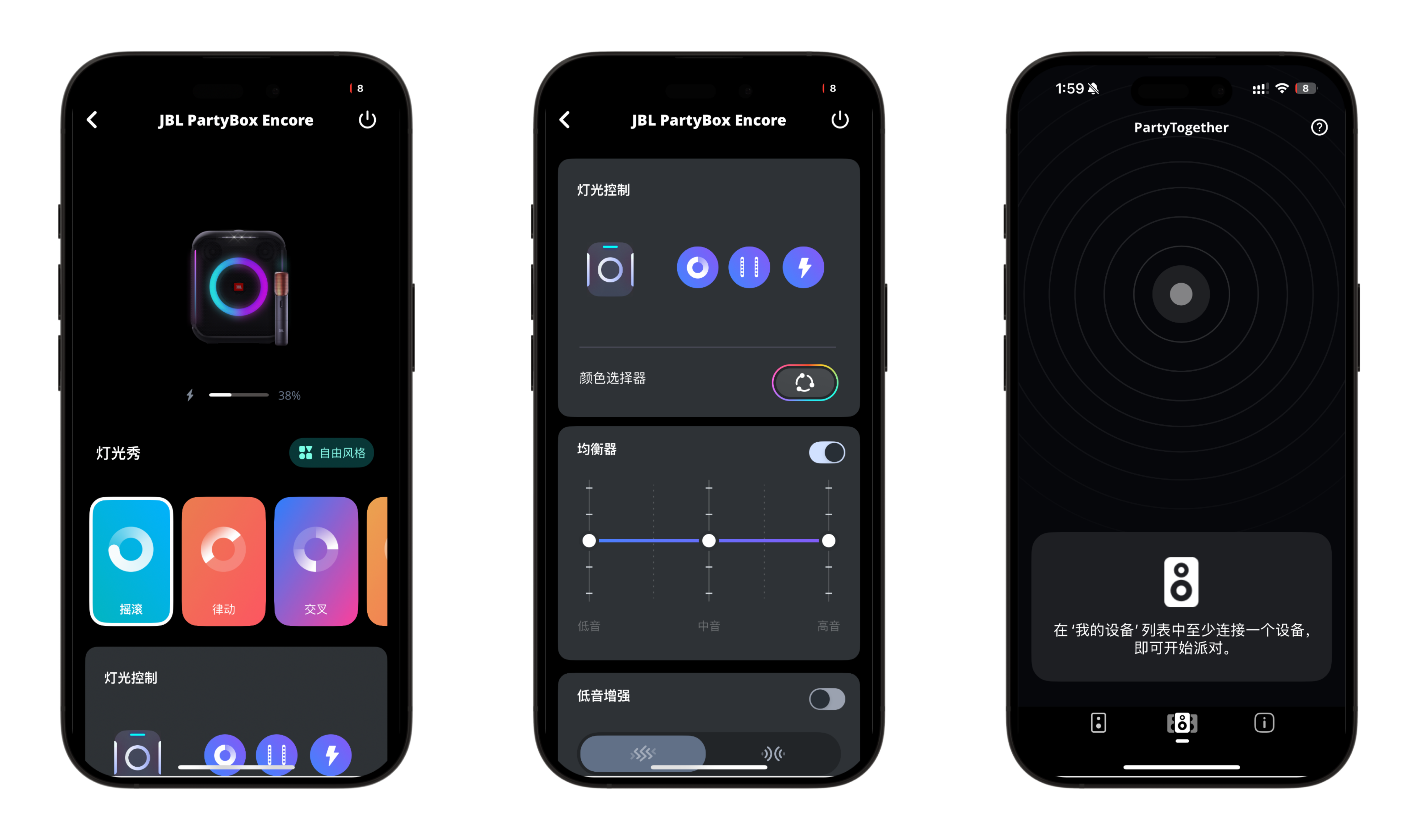配套的手机 APP 功能也大同小异,都能调 EQ 均衡器、控制灯效、切换音效。杰士的 APP 多了个输入源记忆功能,能记住上次用的是蓝牙还是 U 盘,下次打开直接切换过去,挺省心的。杰士的 APP 里有立体声模式和广播模式可选,同时支持多台串联,适合人多的时候用;JBL则对应的有“派对模式”,可以把多个 JBL 音箱连在一起使用。