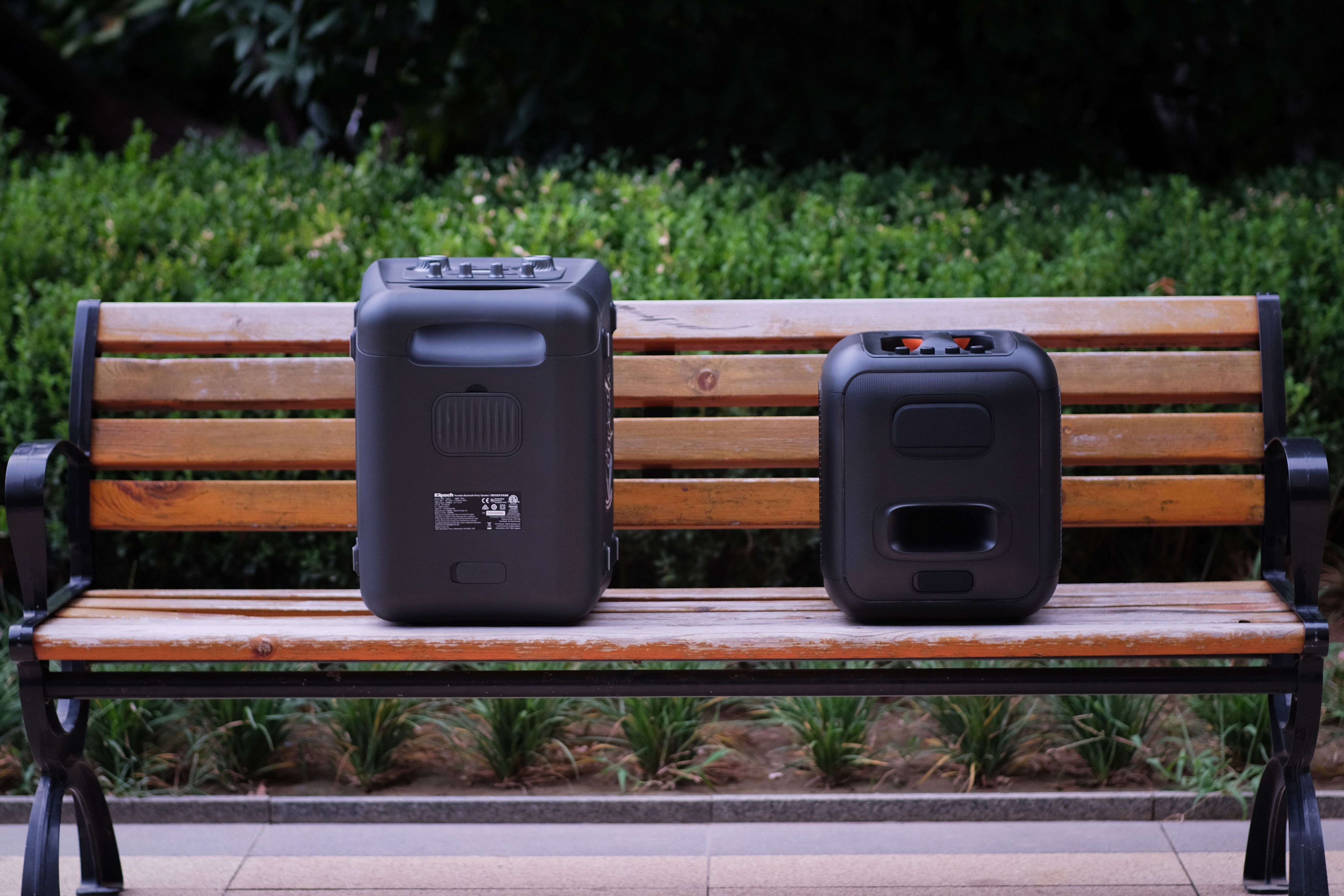 JBL PartyBox Encore 就显得小巧紧凑些,重量轻了差不多一公斤,拎在手里会更轻一些;当然,在发声单元尺寸相同的情况下,箱体容积越大,延展越好,低频也更有优势。