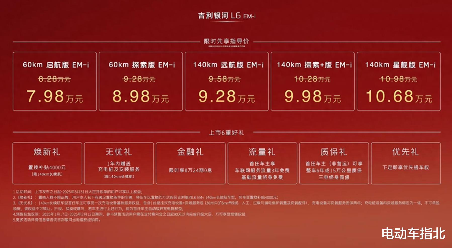 2 月 12 日,银河 L6 EM-i 正式上市,共推出 5 款车型,CLTC 纯电续航为 60km 和 140km,售价 7.98-10.68 万元。新车定位于紧凑型插电混动轿车,采用全新的 EM-i 混动架构,即 P1+P3 电机+单挡直驱,直接竞争对手主要是比亚迪秦 PLUS/海豹 05、秦 L/海豹 06。