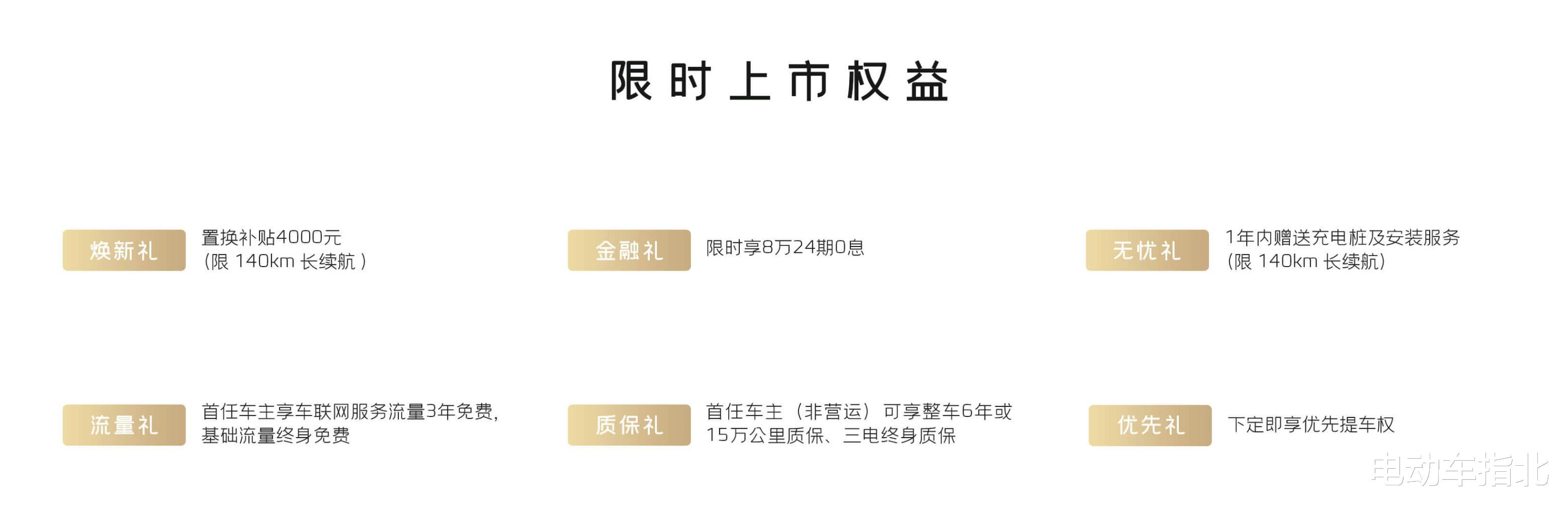 上市权益:首任车主三电终身质保,6 年/15 万 km 整车质保;4000 置换补贴(140km 版本);3 年免费车联流量,基础流量终身免费;140km 版本送充电桩;8 万两年免息贷款。
