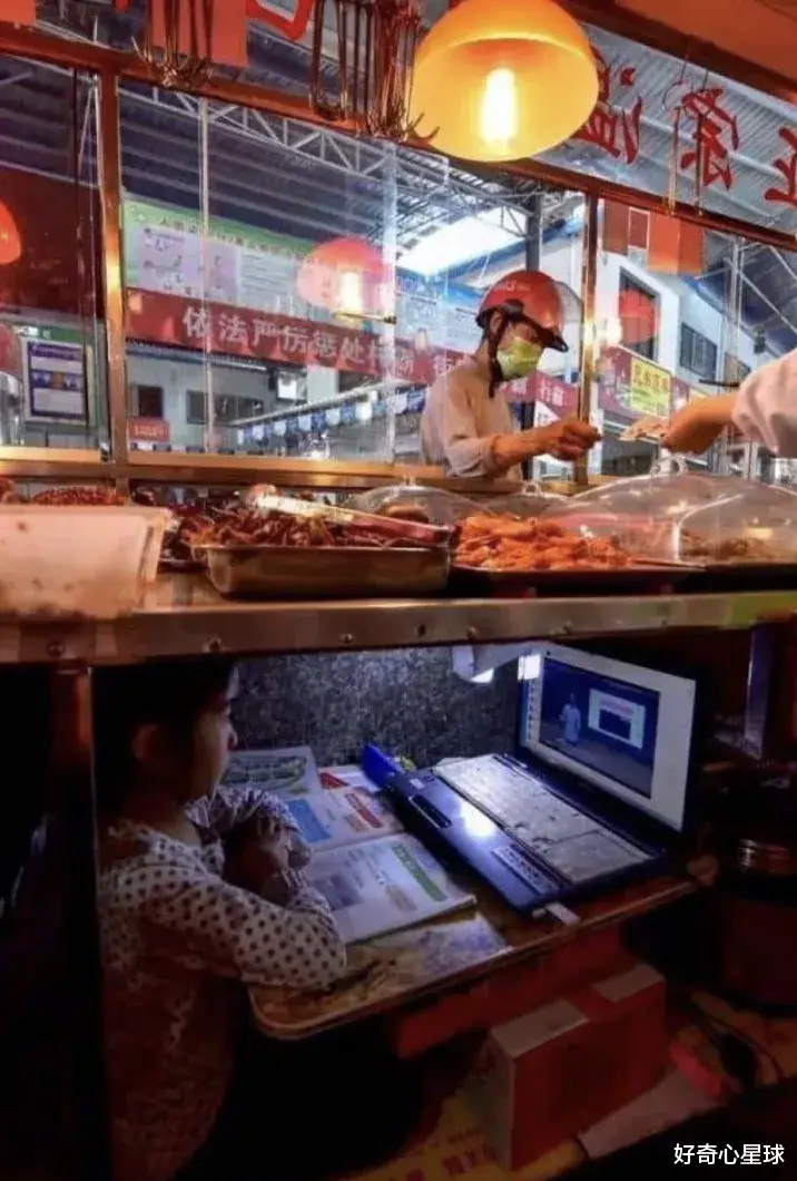 孩子在父母的街头小吃摊下上网课,这一幕太让人泪目了。屏幕的微光向下映照,是孩子专注的未来。这一幕,没有抱怨,只有默契——那是整个家庭正用最朴素的方式,托举着一个安静的梦想。