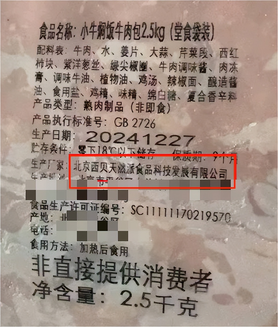 没过多久,就有博主晒出一张包装袋照片,上面印着“北京西贝天然派食品科技发展有限公司”,写着“小牛焖饭牛肉包”,类型是“熟肉制品(非即食)”,还标注了“非直接提供消费者”。