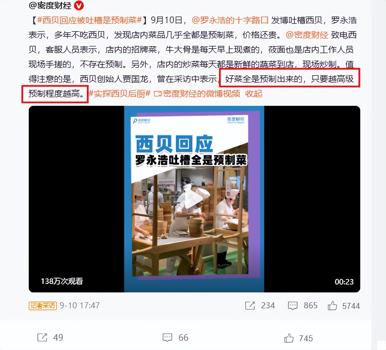 更矛盾的是贾国龙自己的话,有网友扒出他之前接受采访的视频,他曾经说过“好菜全部是预制出来的”。