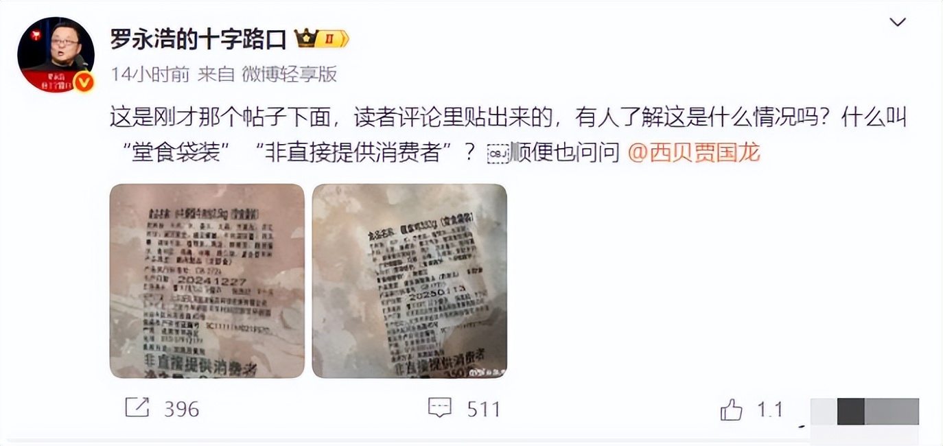 罗永浩立马转发,直接追问贾国龙:“堂食袋装又非直接提供消费者,这到底是啥意思?”