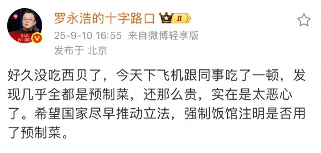 9月10日下午,罗永浩在微博上发文吐槽,西贝餐厅用餐体验太差,几乎全是预制菜,甚至还呼吁国家立法管理预制菜的问题。
