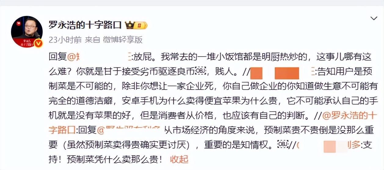 罗永浩后来也解释,自己不是要打西贝:“我对贾国龙没兴趣,就是想借着这事,让预制菜行业透明点,消费者得有知情权吧?”