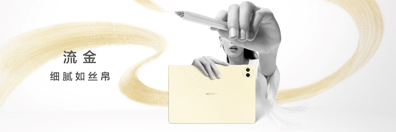 流金、宣白、砚黑三款配色体现了对东方经典美学的致敬,尤其是流金配色,其后盖以中国传统绢帛材质的设计灵感,通过对后盖进行油墨拓印、独家自然纹理、多重光学镀膜、多重转印等多重工艺还原出细腻的丝帛纹理和闪耀的流金视觉效果。这种设计不仅赋予了平板独特的美学价值,也体现了华为在制造工艺上的卓越追求。
