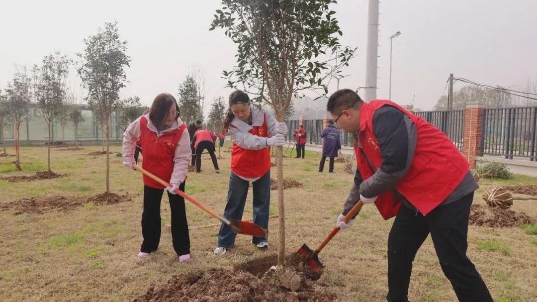 活动现场大家热情高涨,干劲十足,分工协作,整个场面繁忙而有序,气氛欢乐融洽。在大家的共同努力下,一棵棵新栽种的树苗在明媚的阳光下昂然挺立,焕发出勃勃生机。“红马甲”与新绿交相辉映,构成春日里一道亮丽的风景线。